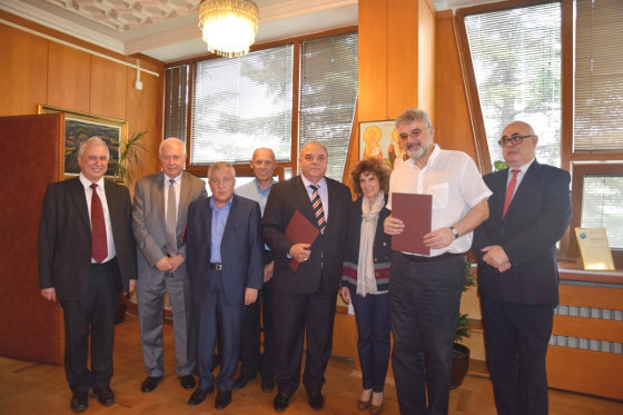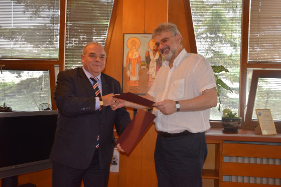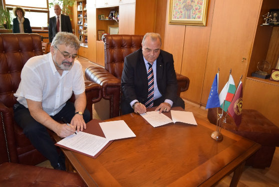 Проф. Статев (вдясно) и проф. Стайнов подписват меморандума